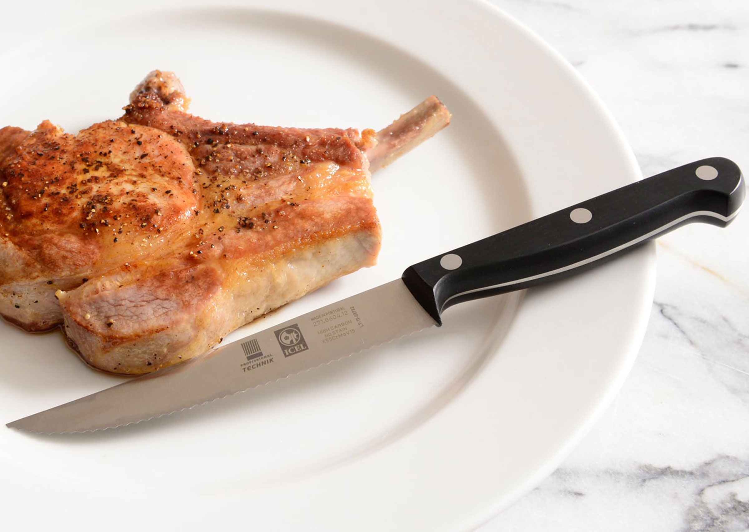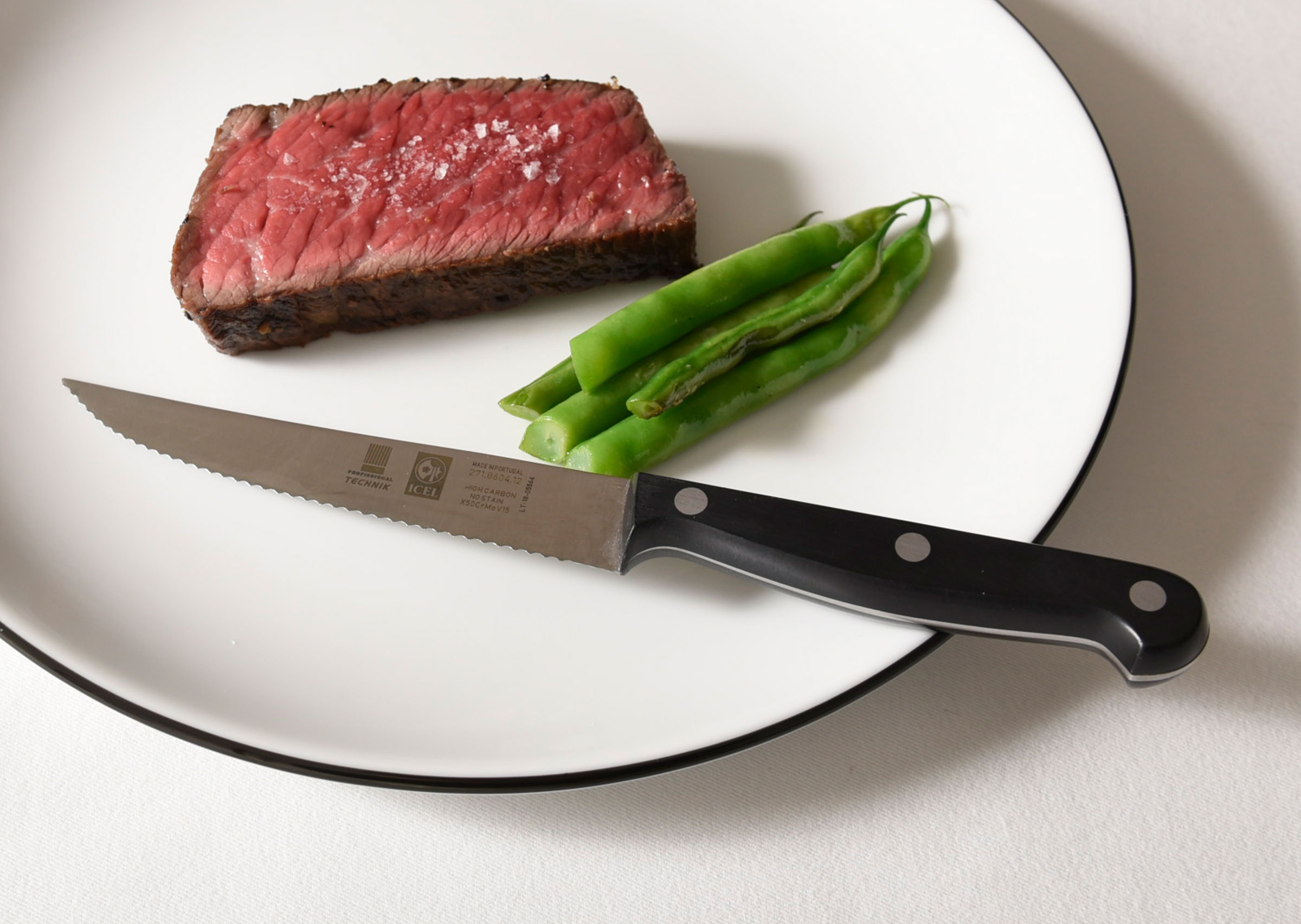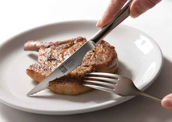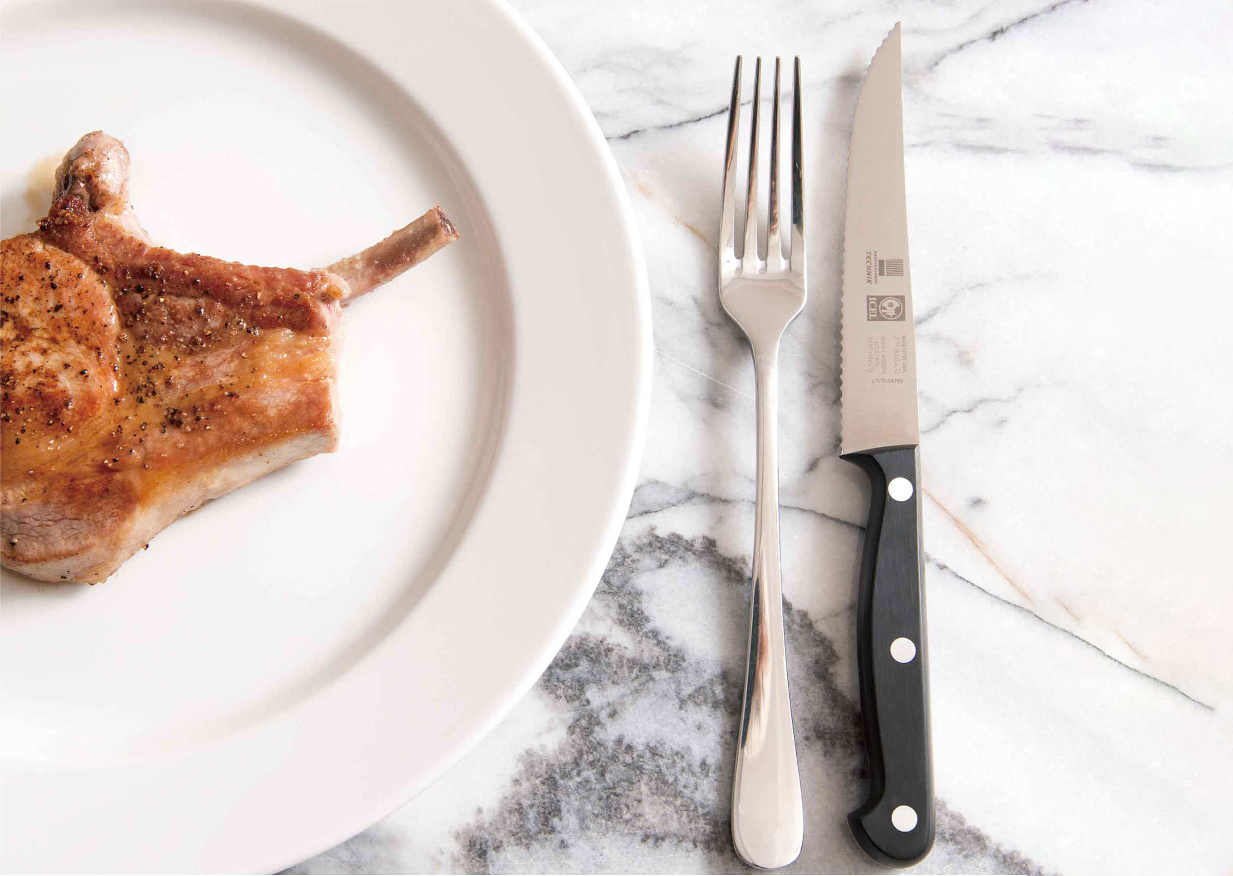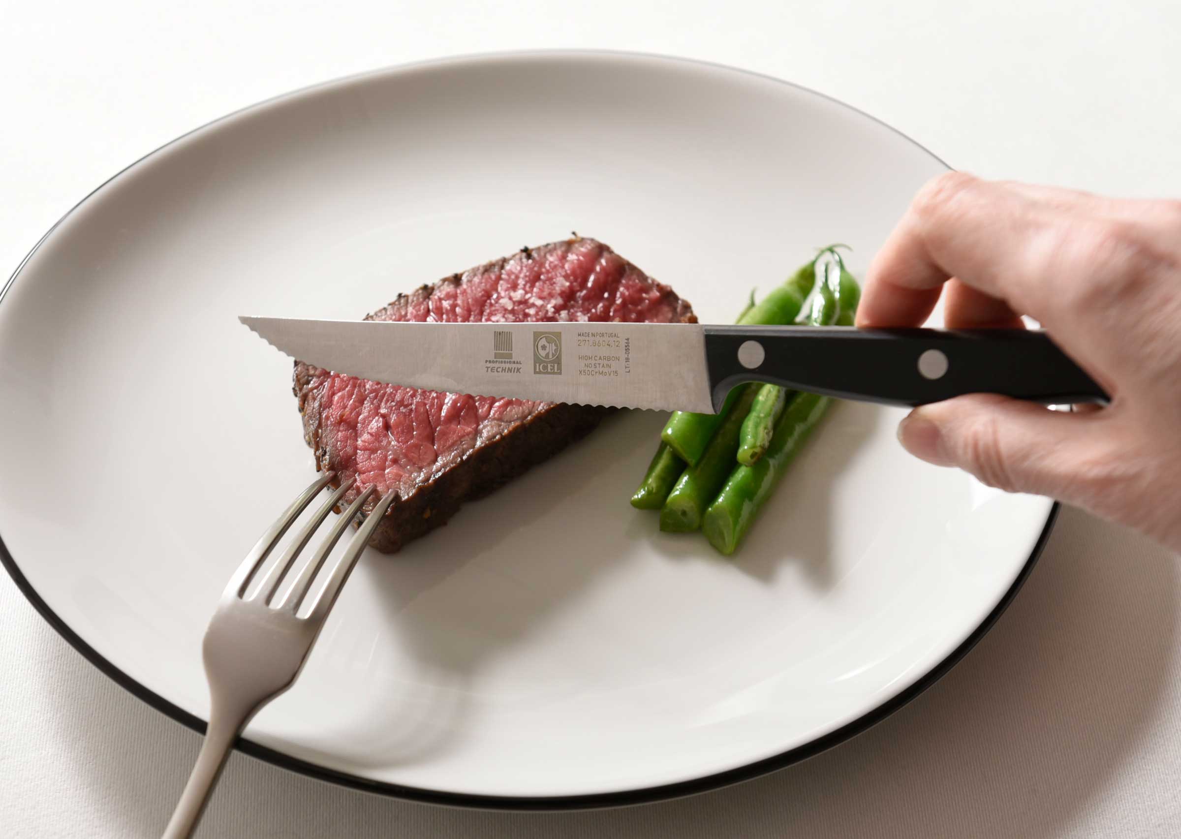 細かい波刃で抜群の切れ味。ニューヨークの有名ステーキハウスでも採用されているステーキナイフはカジュアルなセッティングに向いています。卓上でお持ちのフォークに添えて大胆な演出をお楽しみください。