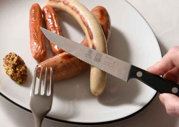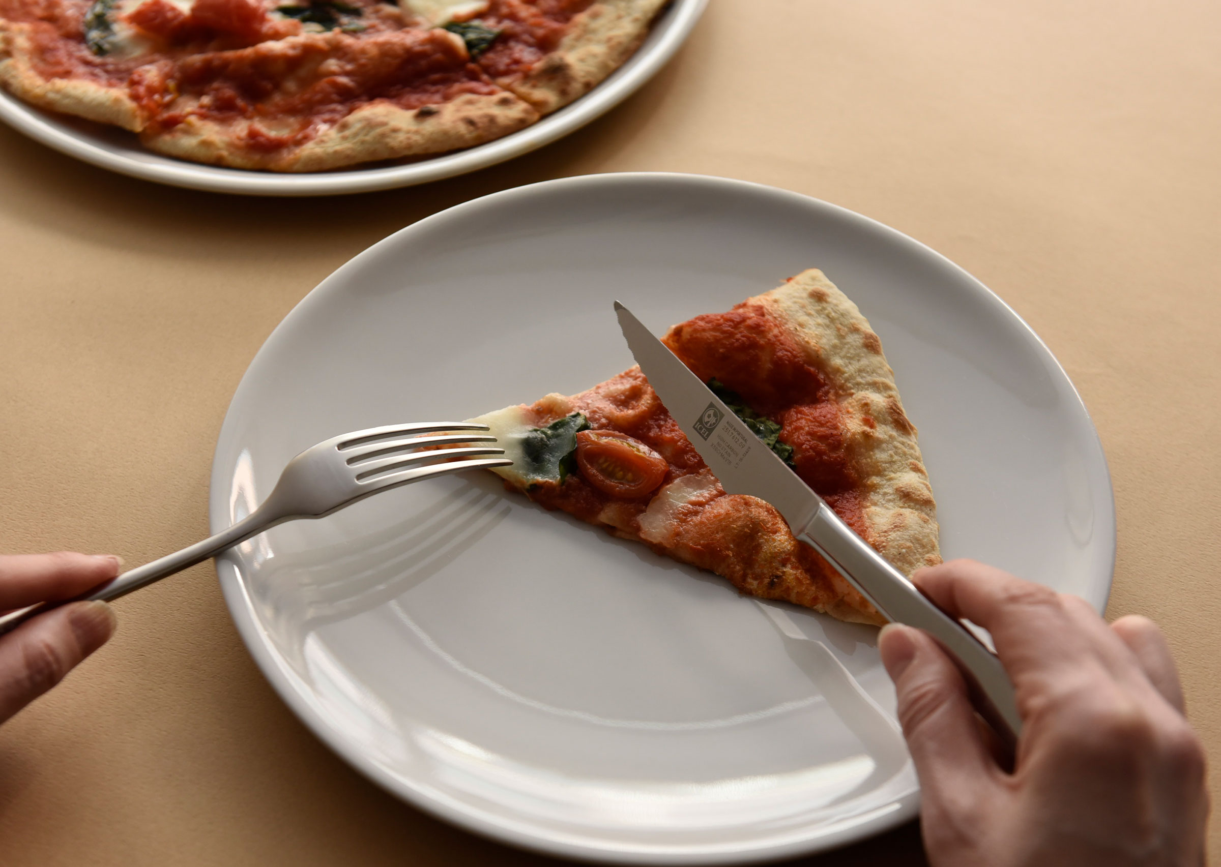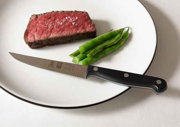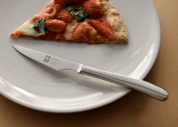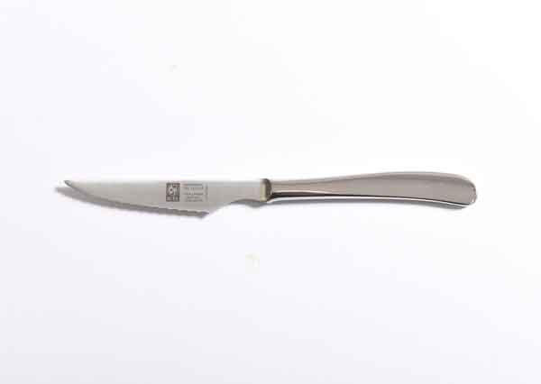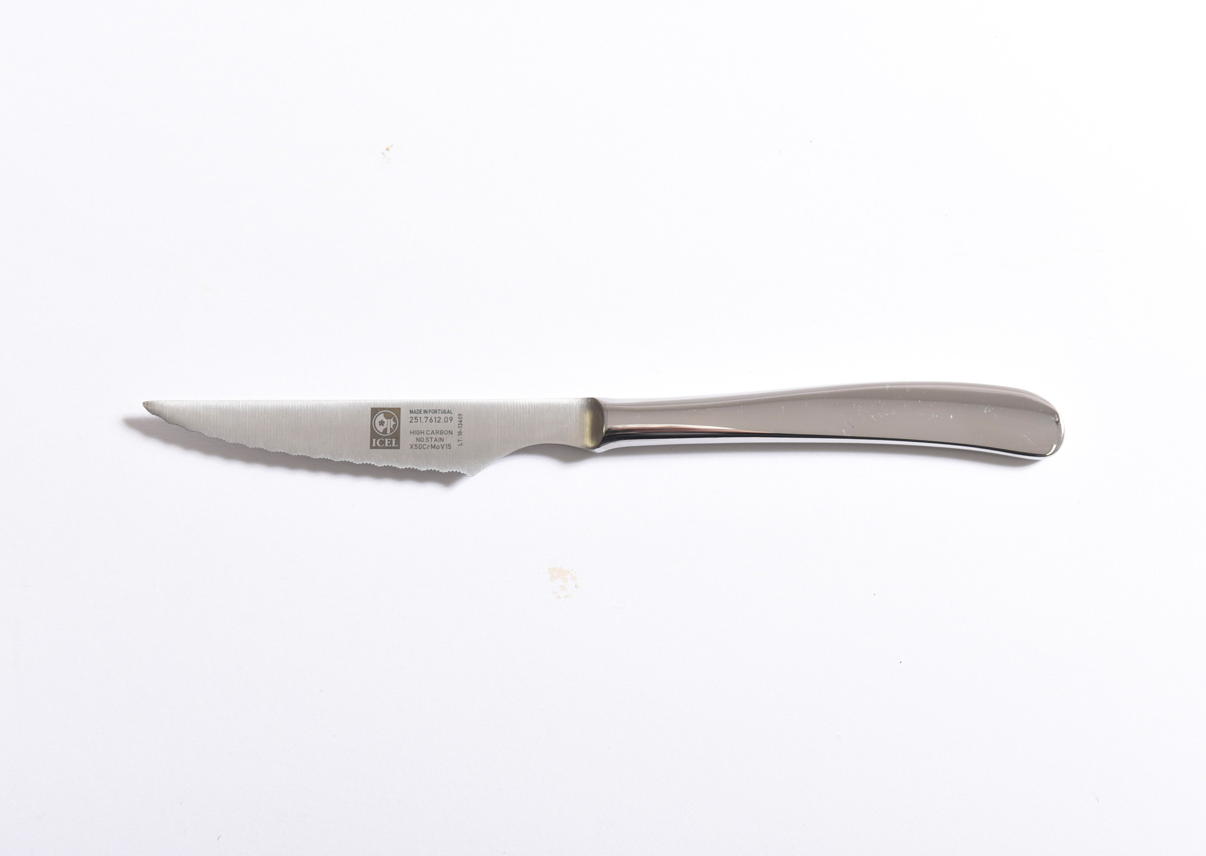 ブレードからハンドルまで継ぎ目のない一体型のナイフ。 セレーションの入ったブレードは切りにくいピザクラストや骨付きのステーキなどに。お持ちのフォークと組み合わせてご使用ください。ステンレス製。