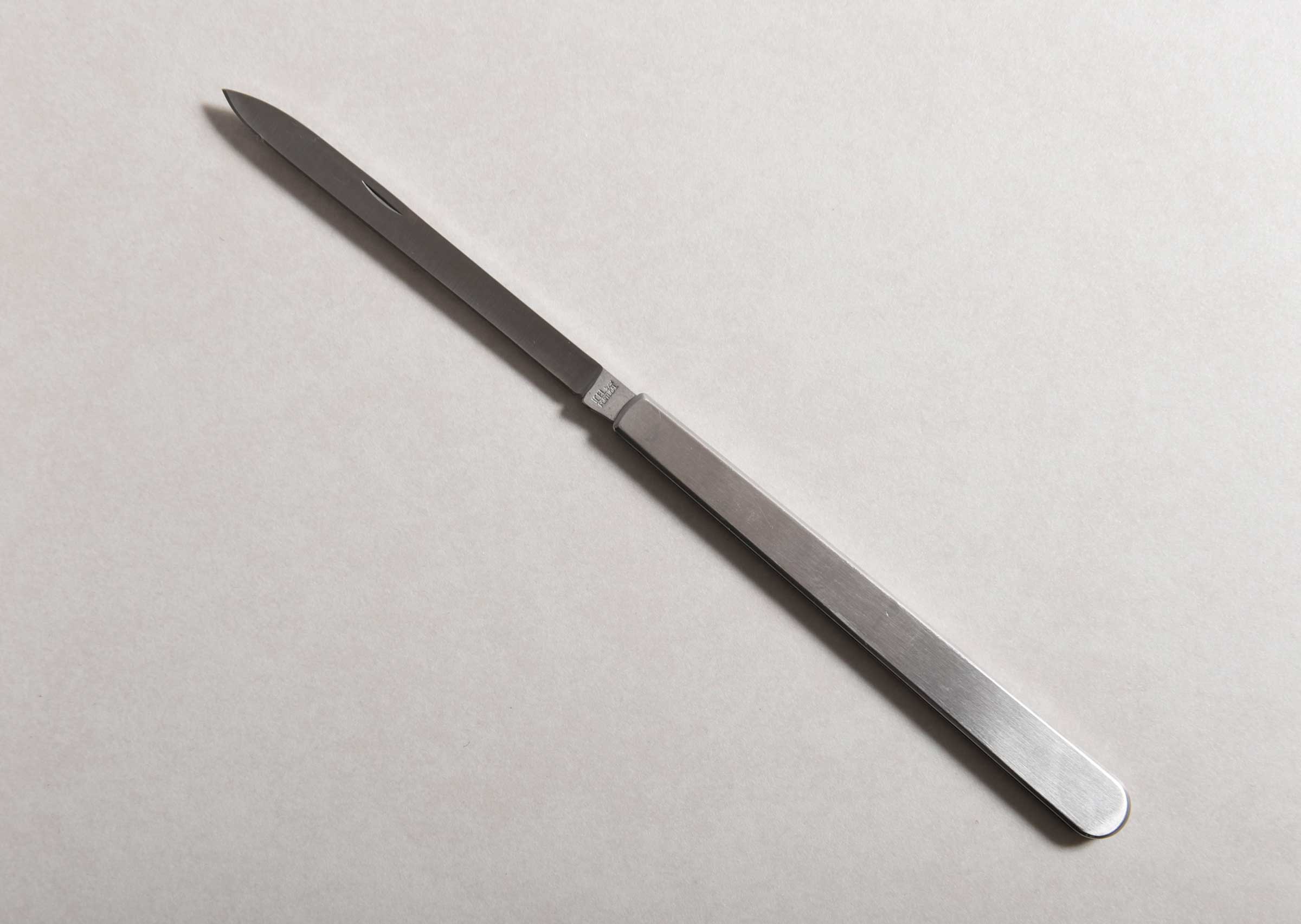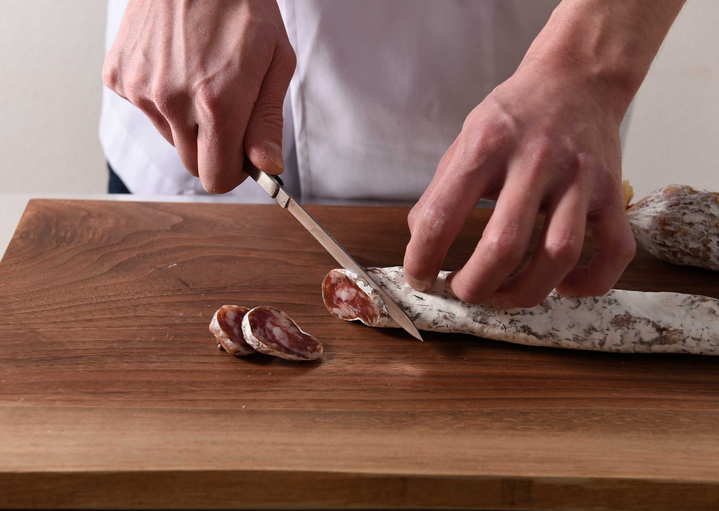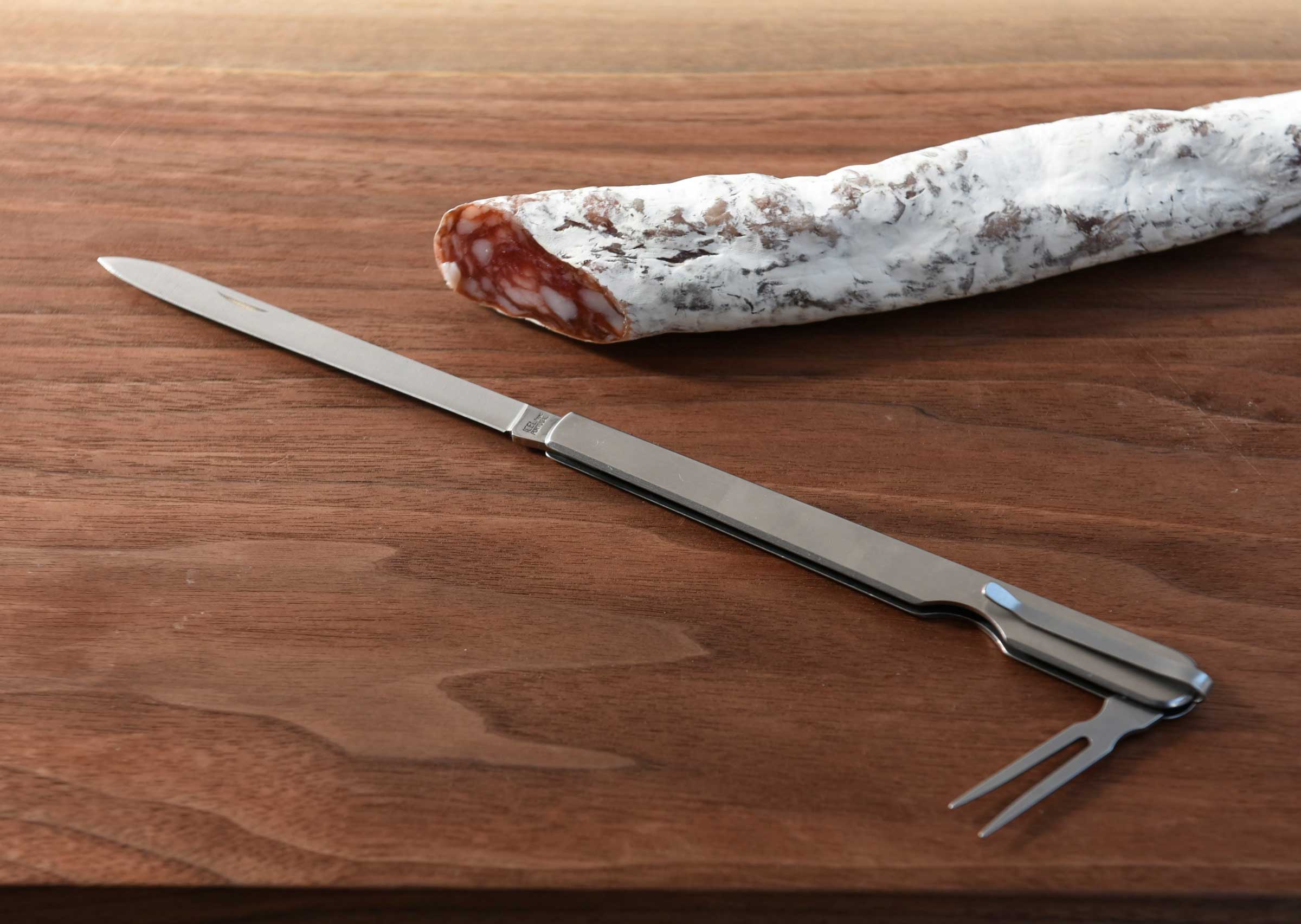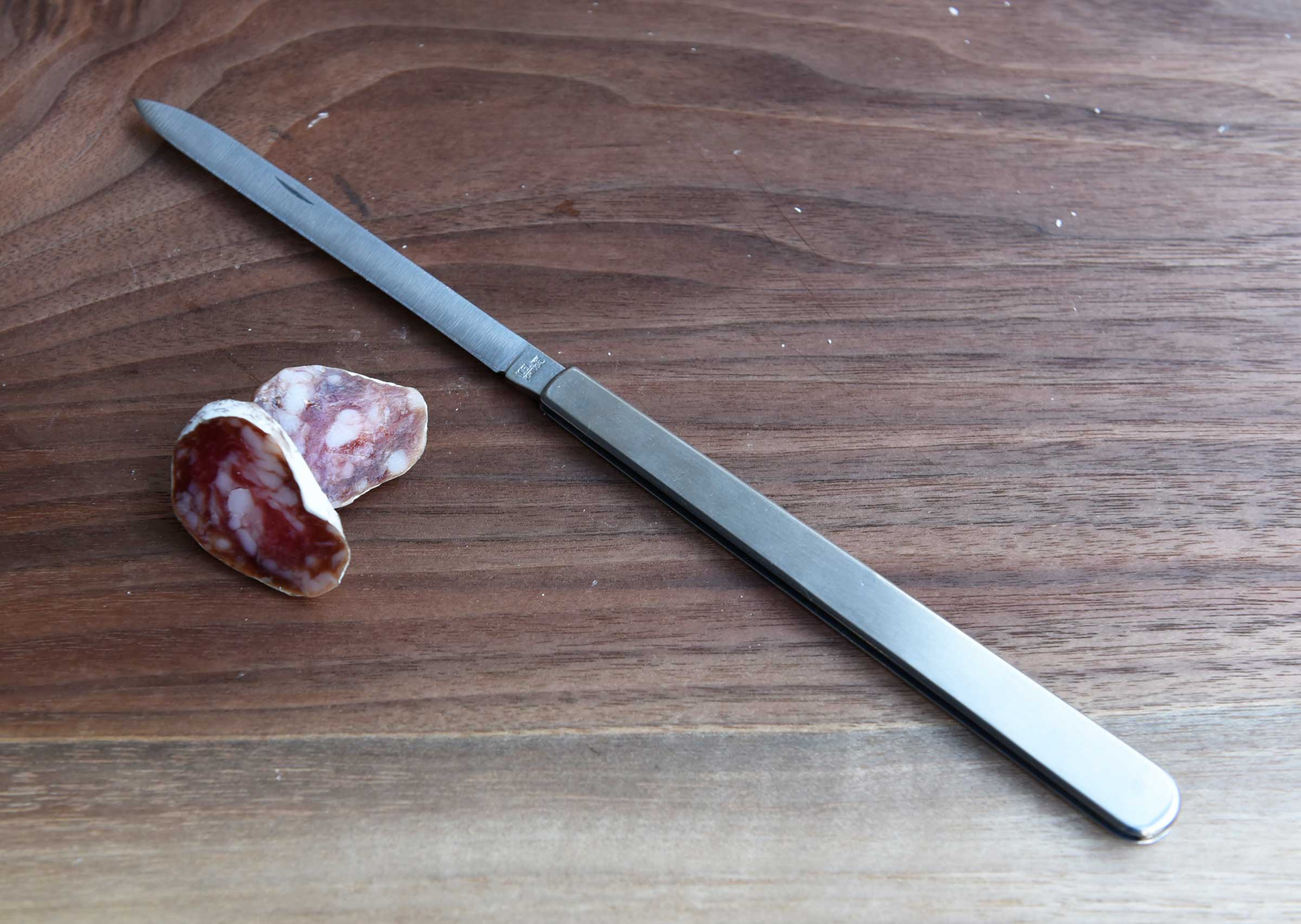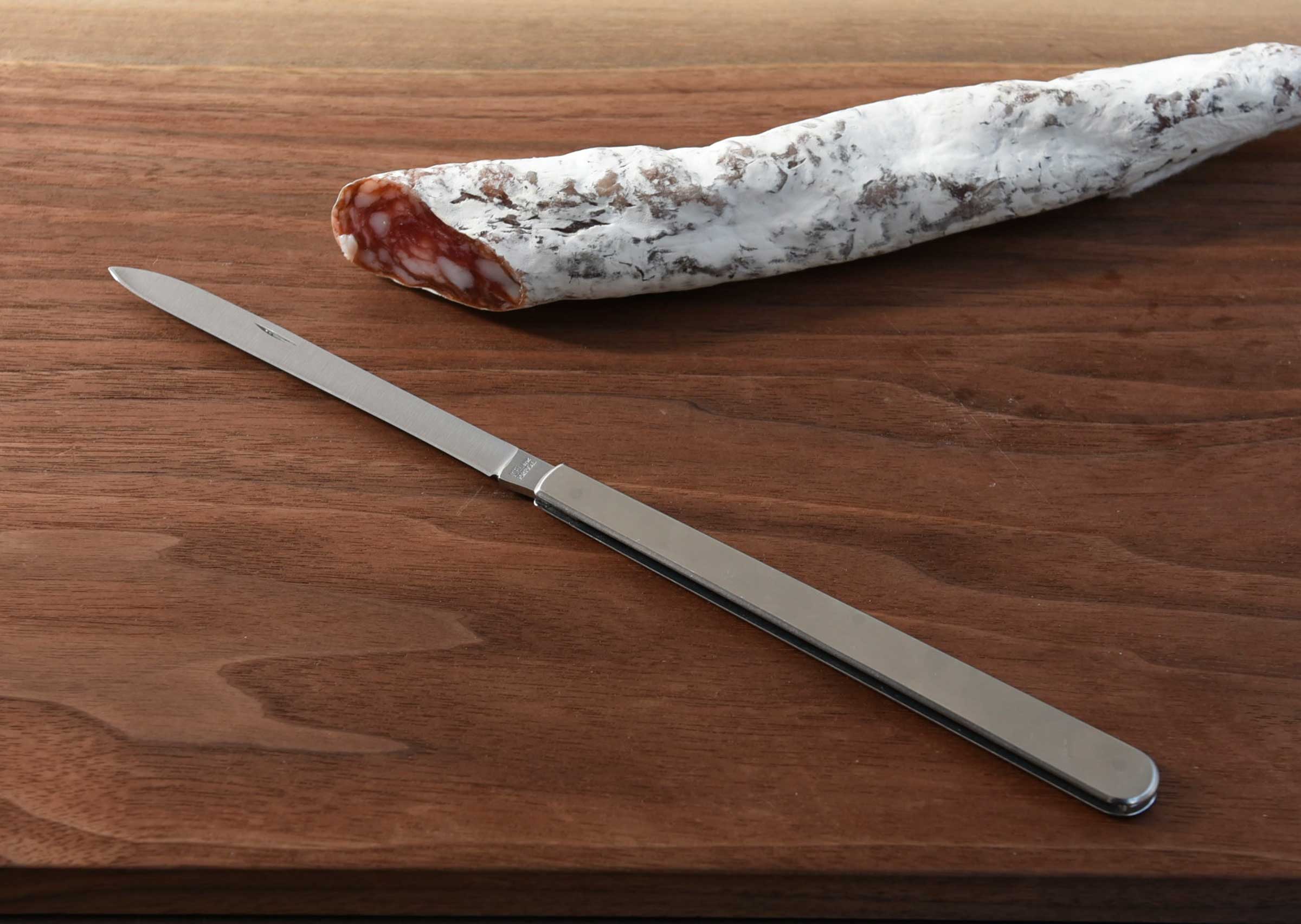 サラミやソーセージ、肉の焼き加減を確認する際などにご使用いただけます。ナイフの刃渡りは10センチ程あるのでステーキナイフ並みの使いやすさ。持ち運びにも便利な折り畳み式ナイフです。ステンレス製。