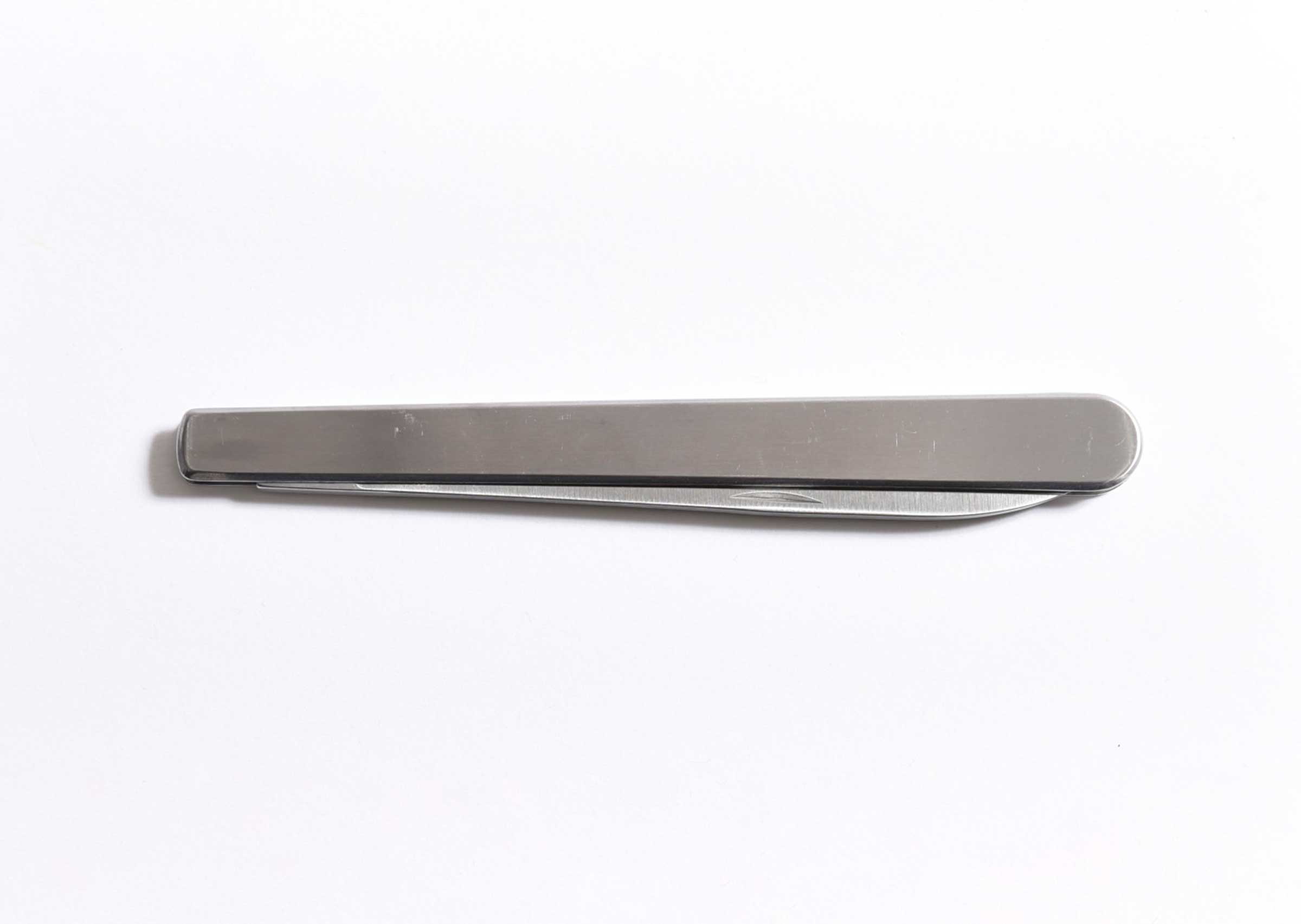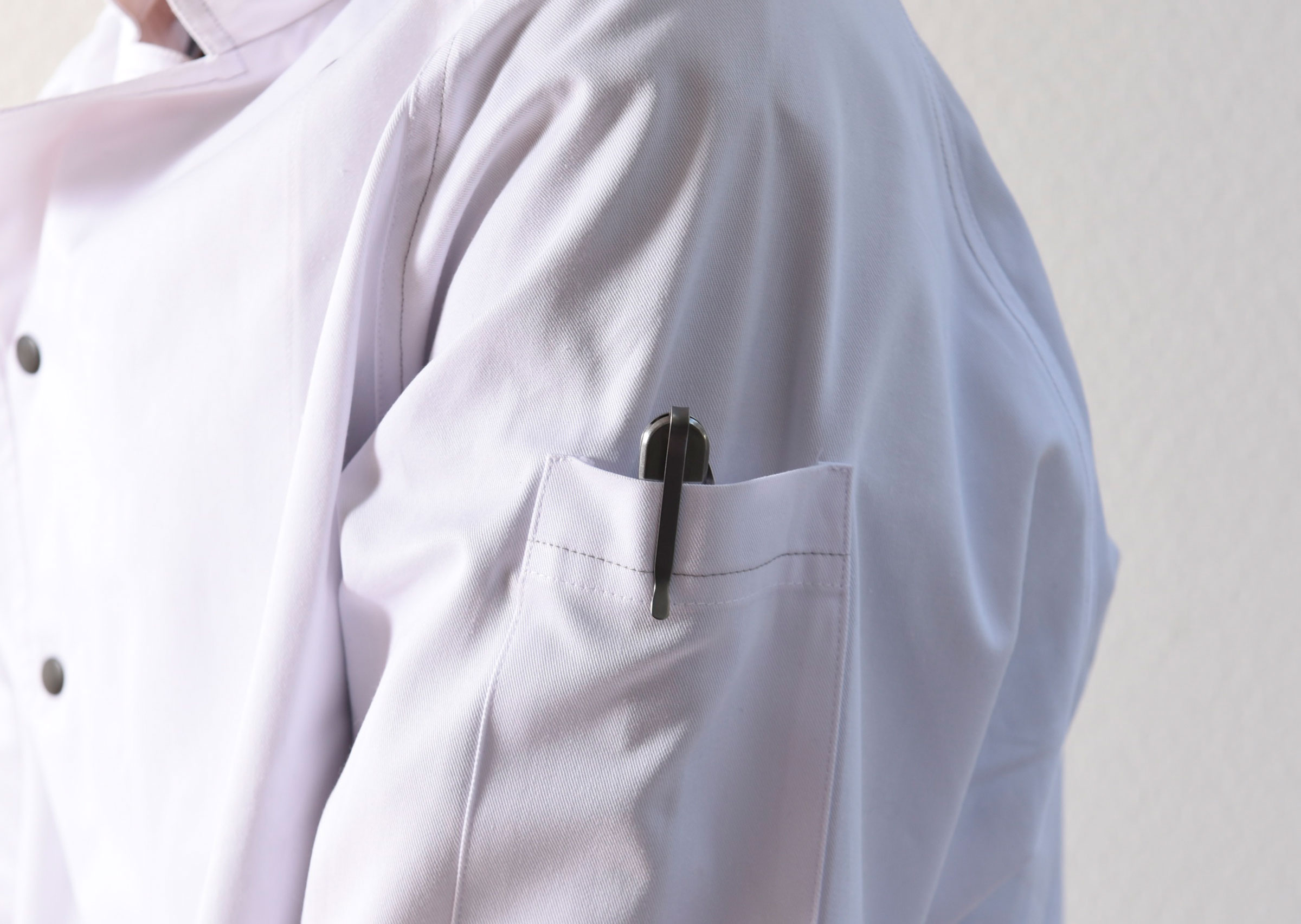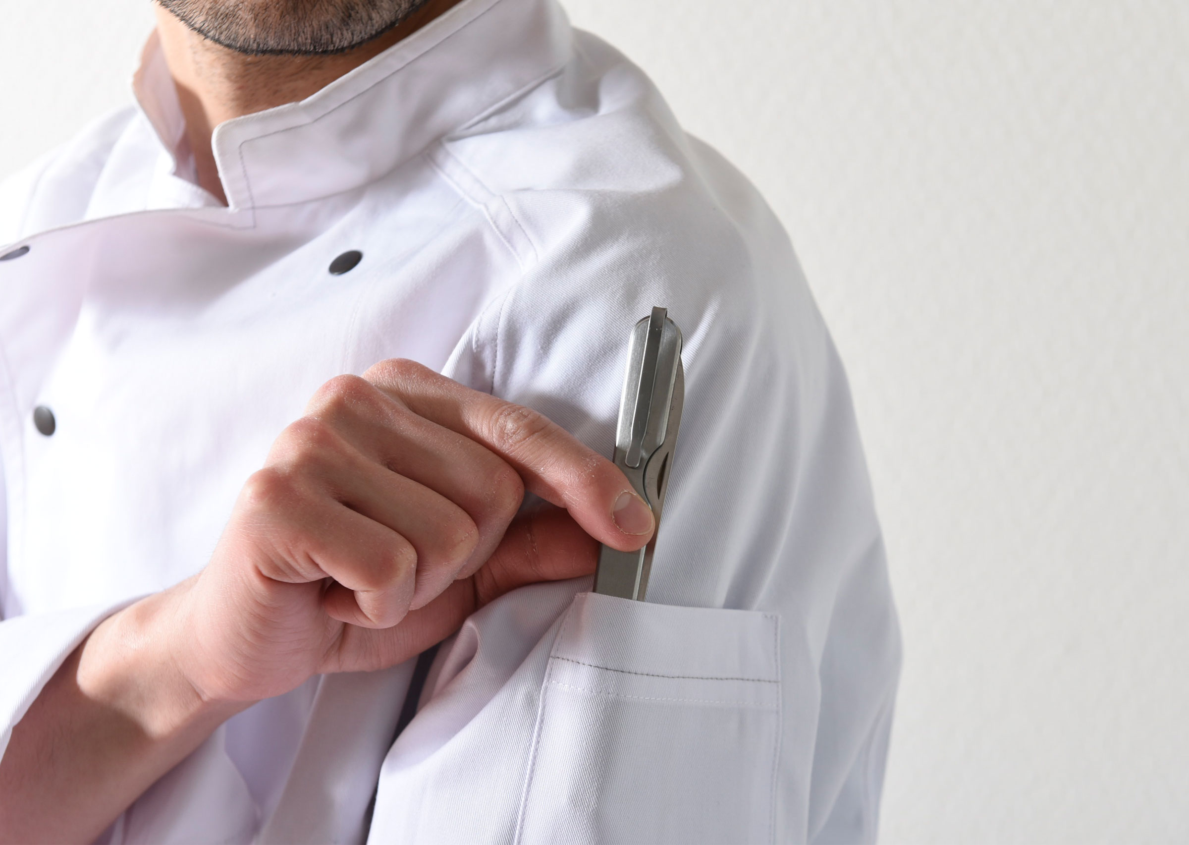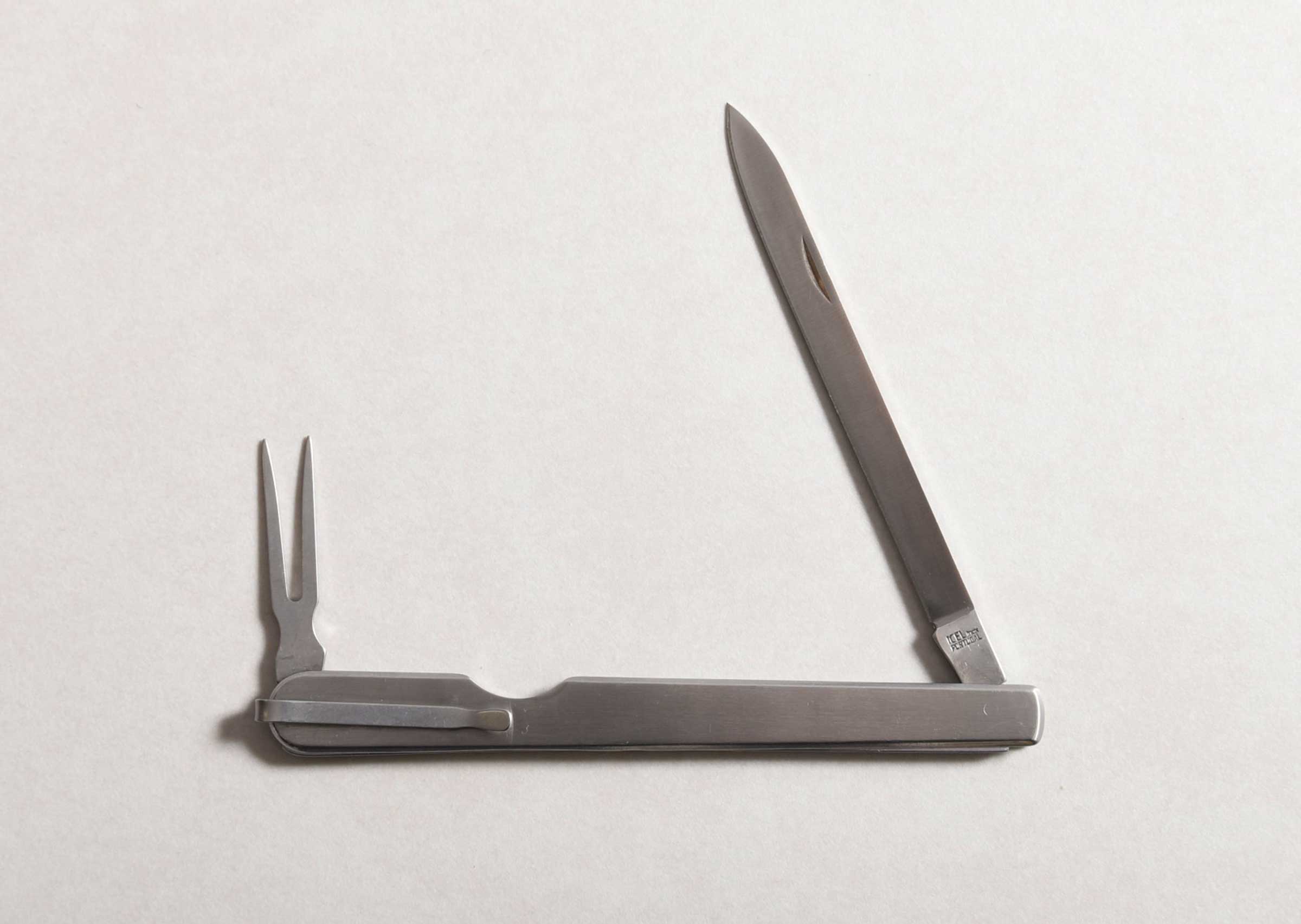 クリップ付きでシェフジャケットのポケットに差したり持ち運びにも便利な折り畳み式ナイフです。ナイフの刃渡りは10cm程あるのでステーキナイフ並みの使いやすさ。食材を刺したり、ひっくり返すことができるフォーク付きです。ステンレス製。