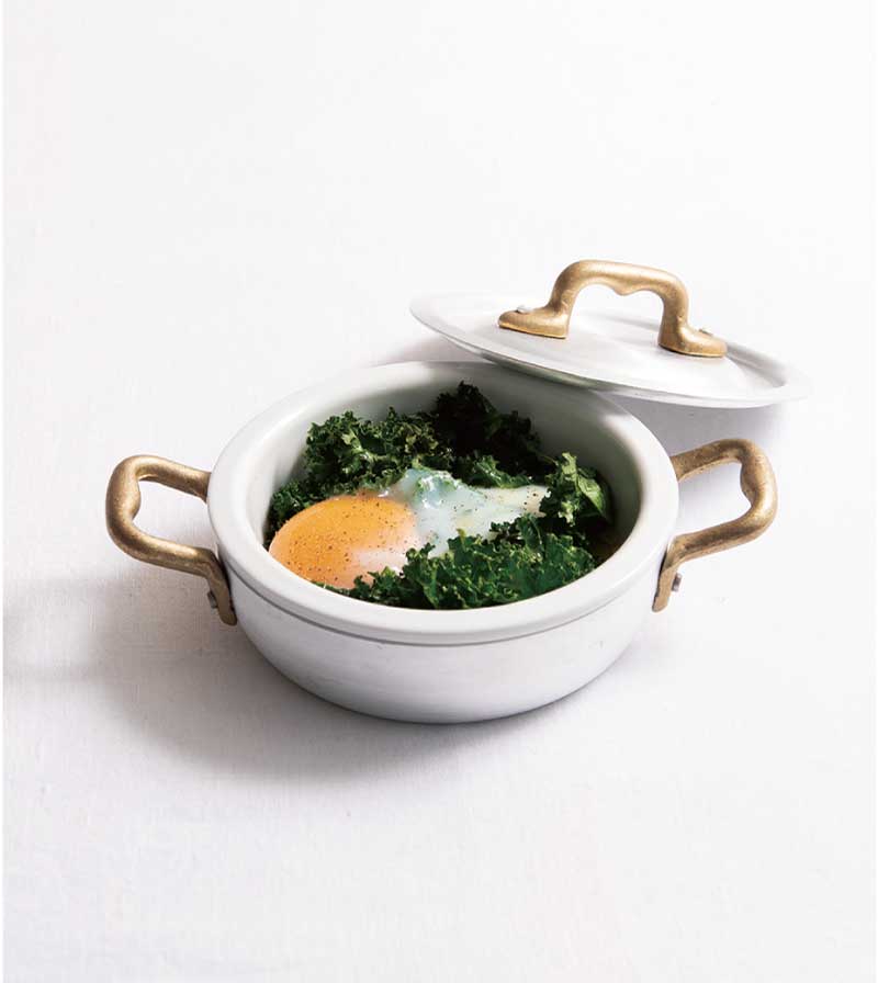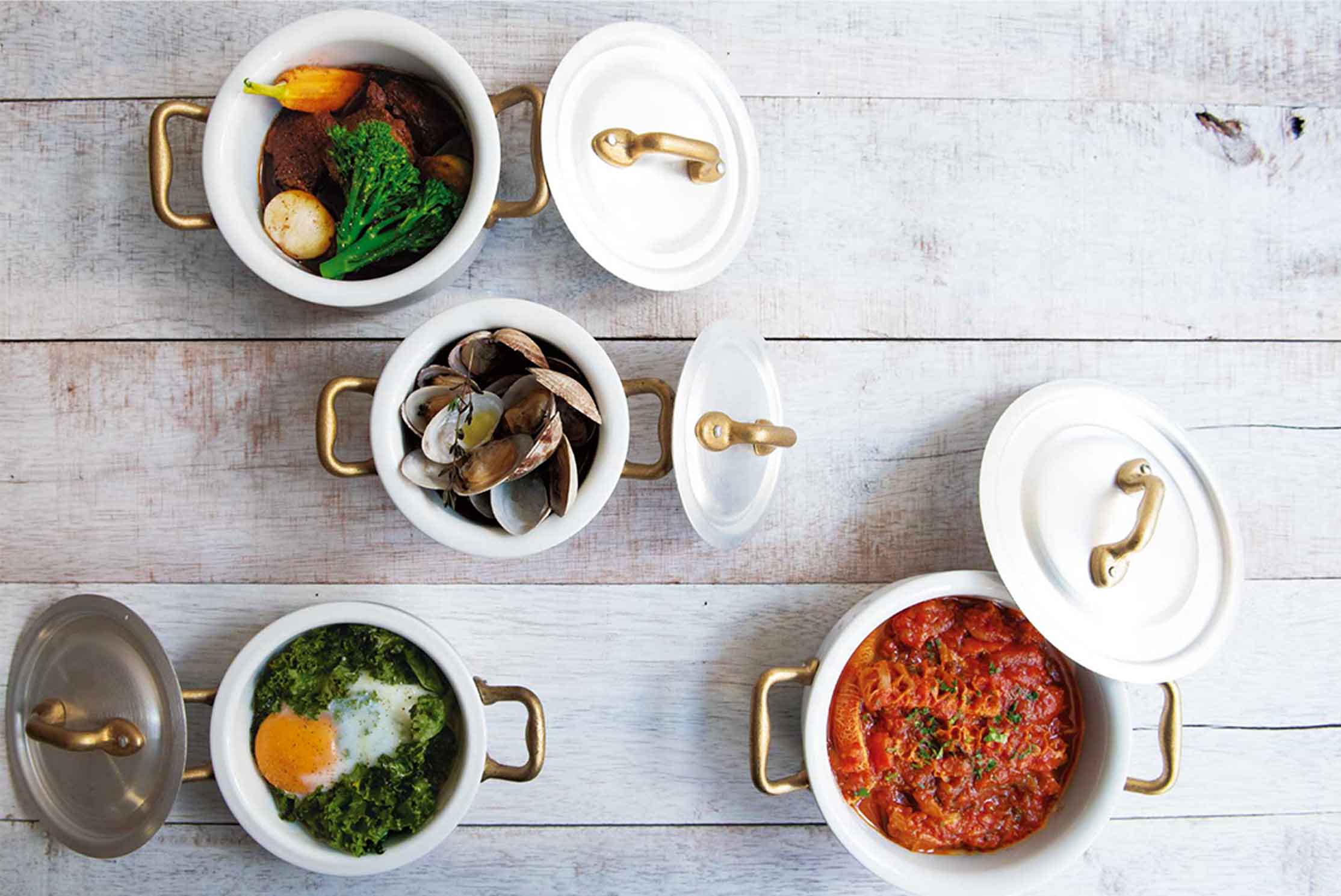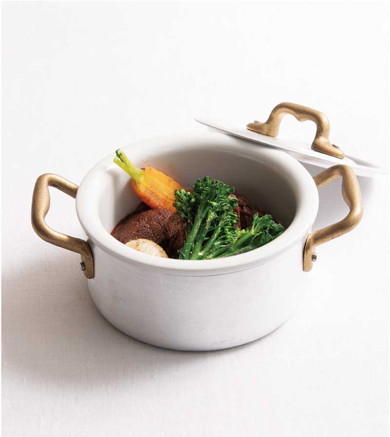 お一人様用の料理を熱々のまま食卓にサービスできる、器の機能を兼ね備えた、アルミ製の両手鍋とセラミックポットのセットです。あらかじめセラミックポットに仕込んでおいた、グラタンなどのオーブン料理やシチューをアルミの鍋にセットし、そのまま食卓へ。フタをあけた瞬間、ゲストもきっと喜ぶはず。