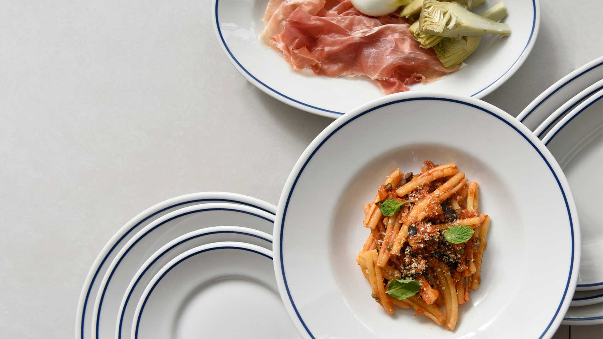 盛り付けやすい形と定評のイタリア料理の食卓には欠かせないチボリシリーズにブルーラインを施しました。現地イタリアではシチリア料理他、南の地域で使われるブルーライン。ローマ同様、魚貝や赤いトマト、レモンなどが映える色味に加え、チボリならではの幅広いリムの立ち上がりが程よい深さを持たせ、よりどっしりとした趣に仕上がりました。