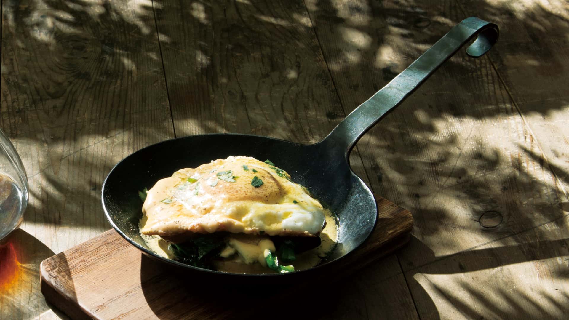 再度火にかけ水分を飛ばしてから、油を入れて目玉焼きを焼く。焼き上がったら、5のベーコンの上に乗せる。