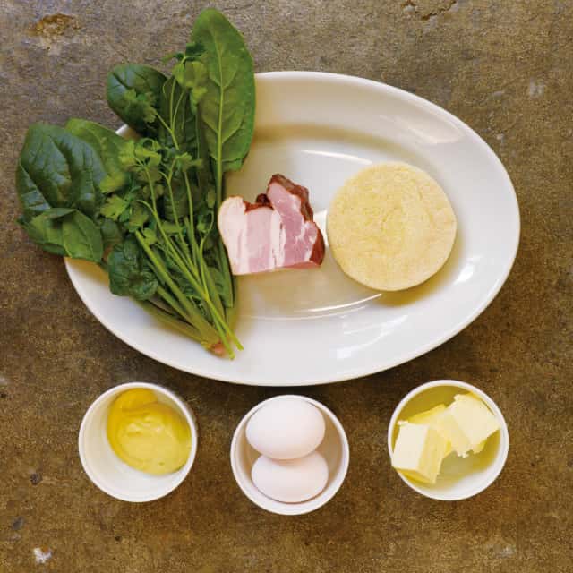 5.2のイングリッシュマフィンに、4で焼いたほうれん草とベーコンを乗せる。