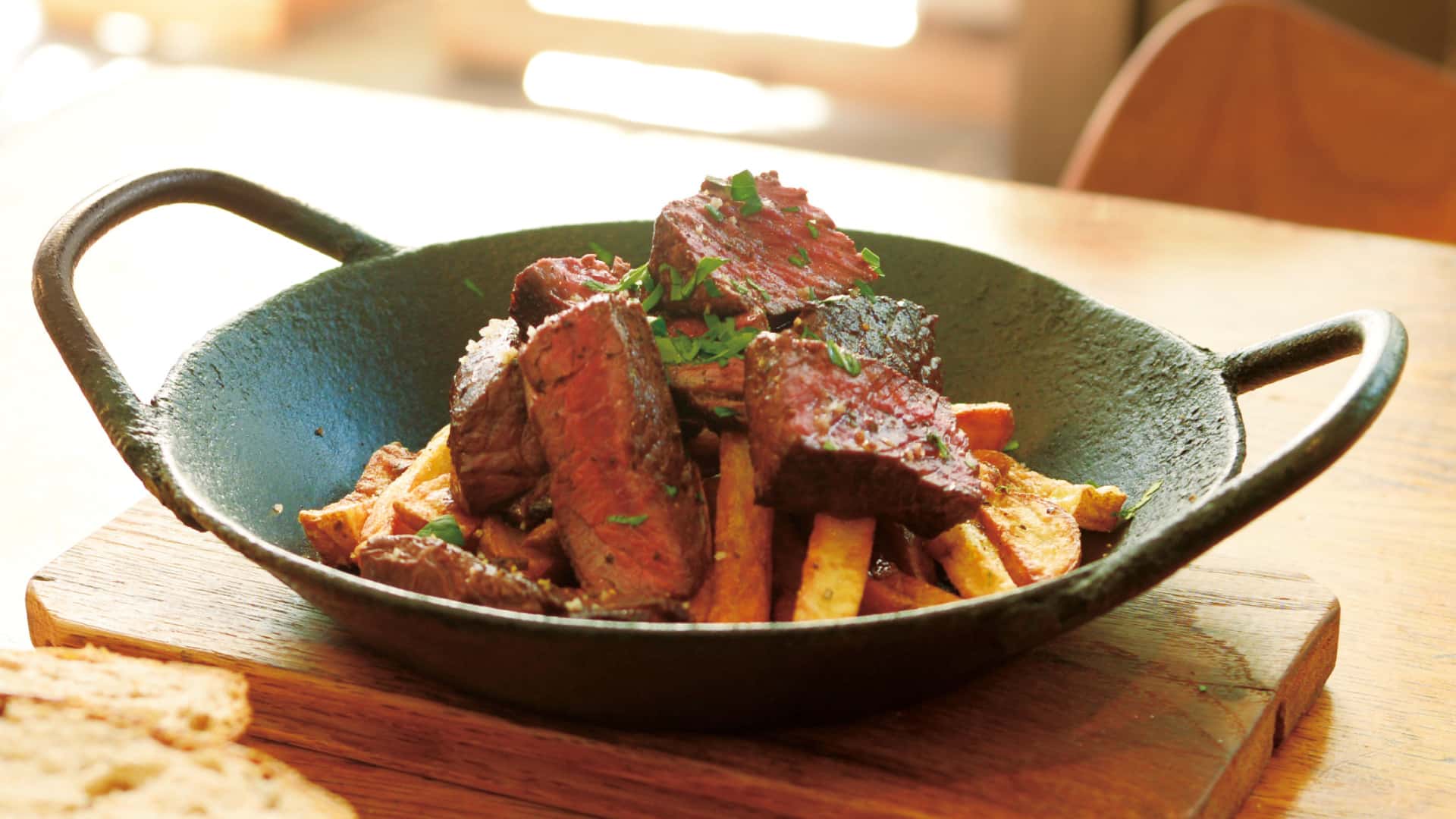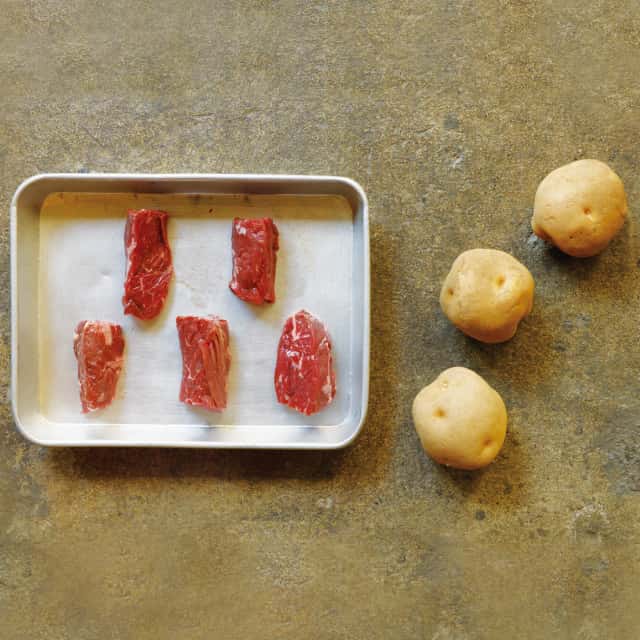 4.焼いたハラミを食べやすい大きさにカットして、素揚げしたジャガイモの上にハラミを乗せ、コショウをふって、
