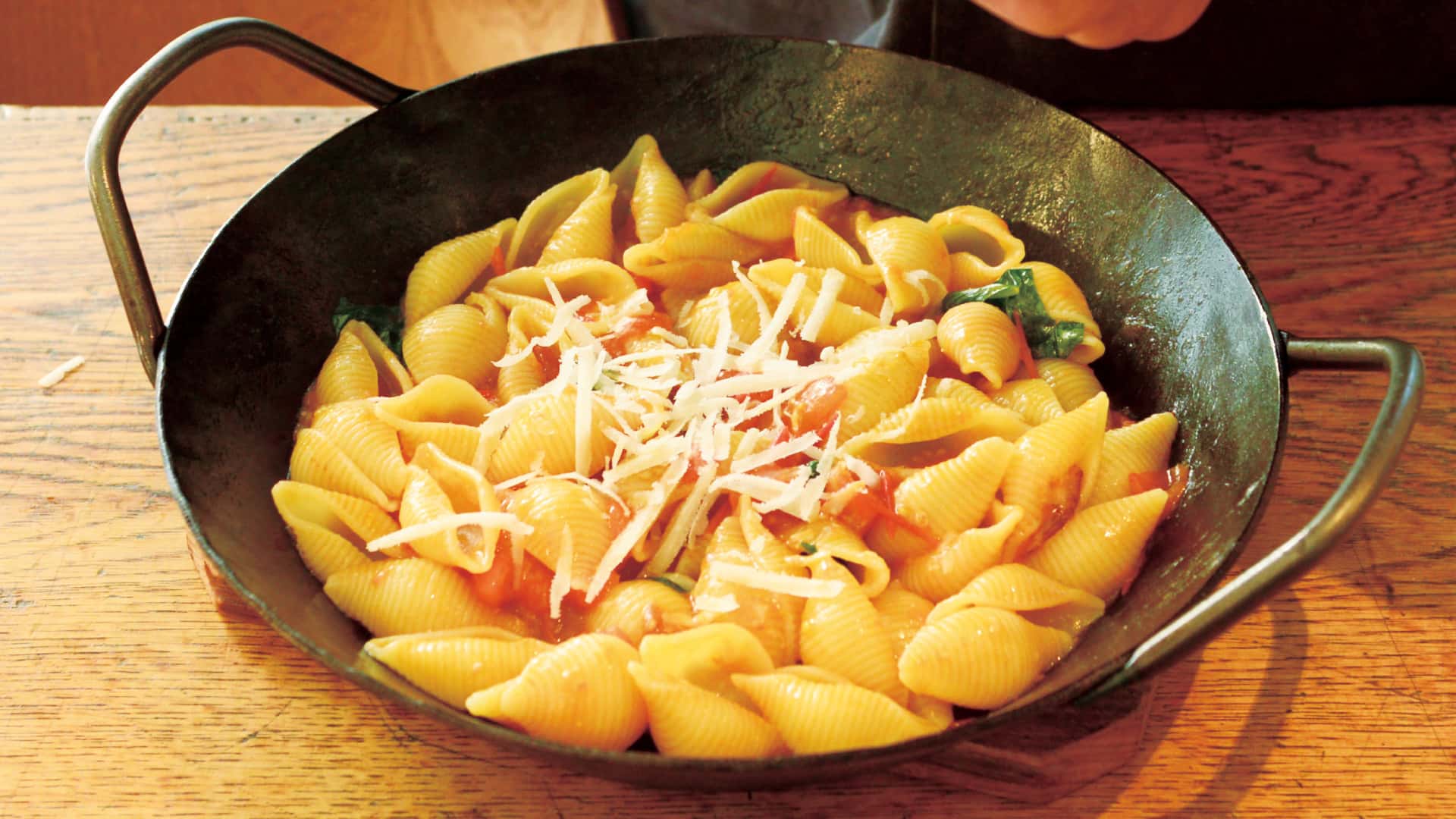3.パスタが茹で上がったら、1のトマトソースにパスタを絡め、おろしたパルミジャーノを加える。
