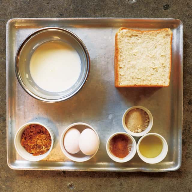 1.卵をボウルに割りほぐし、卵、きび砂糖、ハチミツ、牛乳、生クリームを混ぜ合わせる。