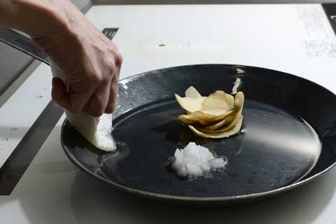 じゃがいもの皮が茶色くカリカリになり、塩も茶色くなったら火を止めます。