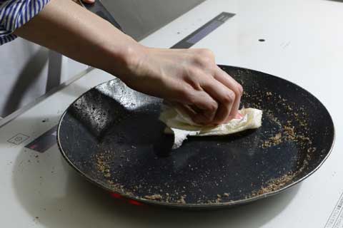ペーパーをサラダ油に浸し油がまわっていない内側立ち上がり部分の鍋肌にたっぷりと馴染ませます。