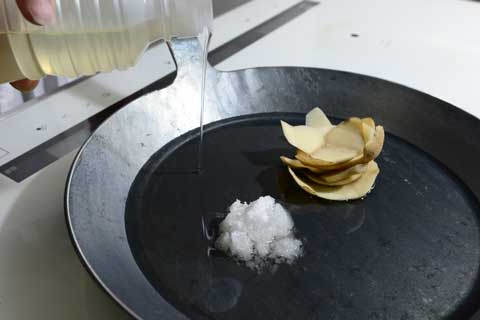 まだ加熱はしていません。タークに、サラダ油、塩、じゃがいもの皮を入れます。